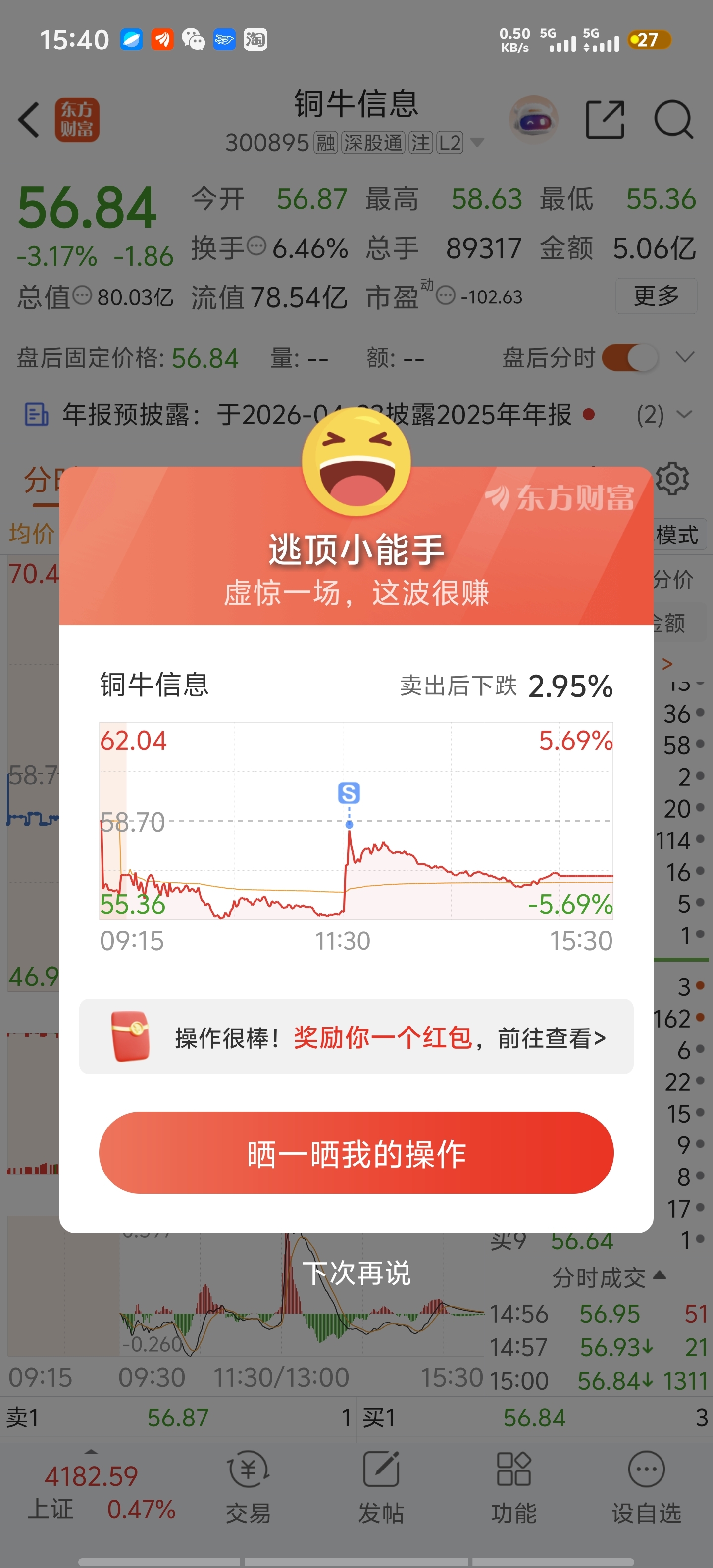 $铜牛信息(SZ300895)$ 一日游,半仓亏一个点走了