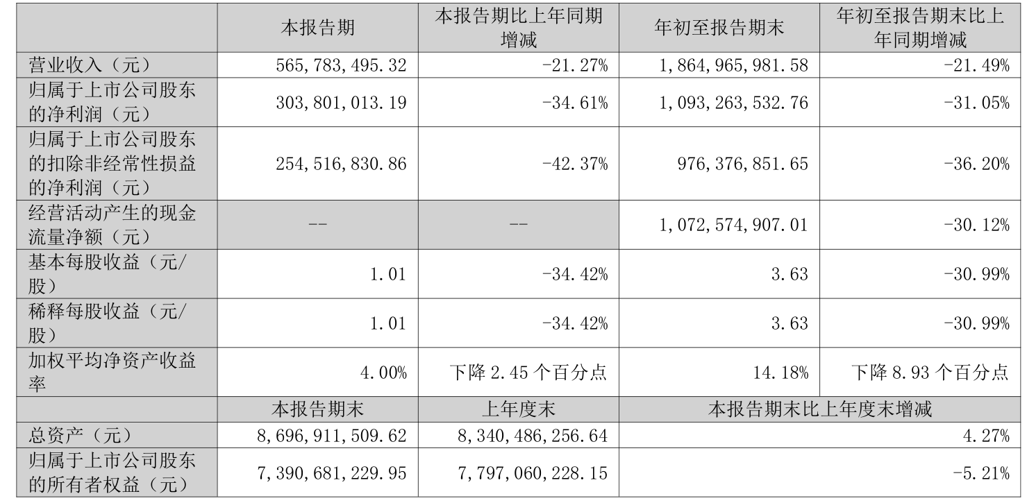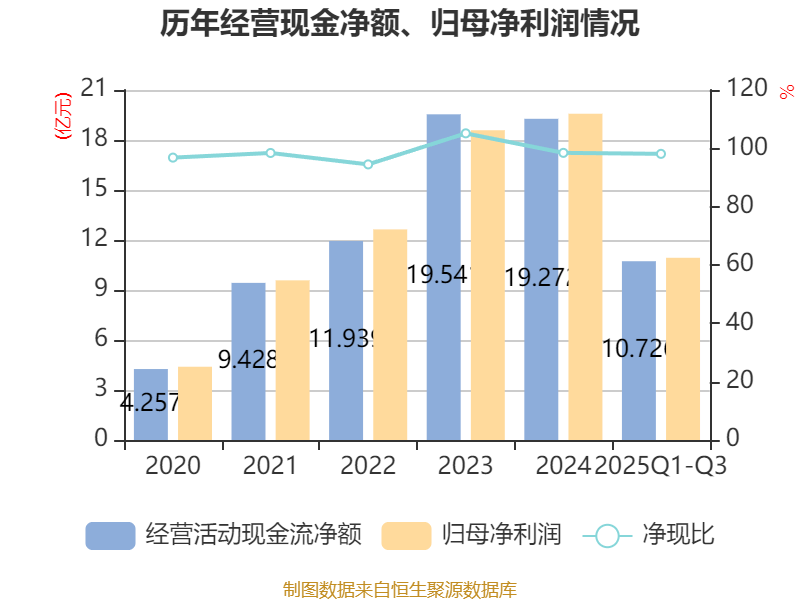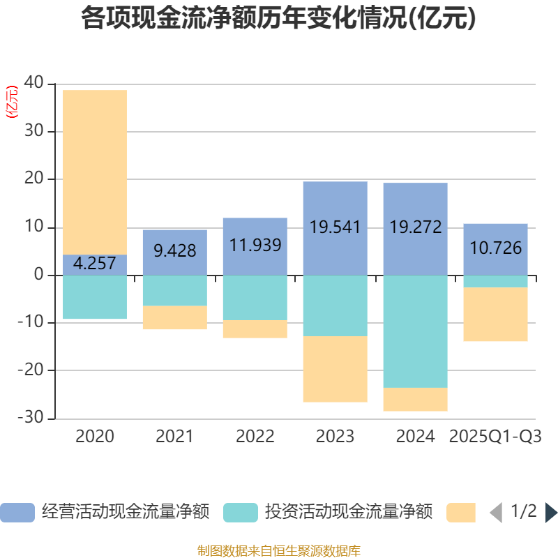 2025年前三季度,公司经营活动现金流净额为10.73亿元,同比下降30.12%;筹资活动现金流净额-11.24亿元,同比减少6.1亿元;投资活动现金流净额-2.61亿元,上年同期为-18.59亿元。