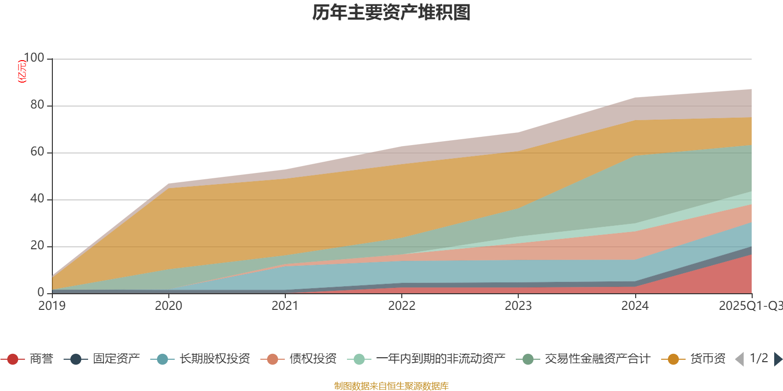 资产重大变化方面,截至2025年三季度末,公司商誉较上年末增加493.44%,占公司总资产比重上升15.65个百分点;交易性金融资产合计较上年末减少31.44%,占公司总资产比重下降11.82个百分点;债权投资较上年末减少36.68%,占公司总资产比重下降5.69个百分点;货币资金较上年末减少22.09%,占公司总资产比重下降4.59个百分点。