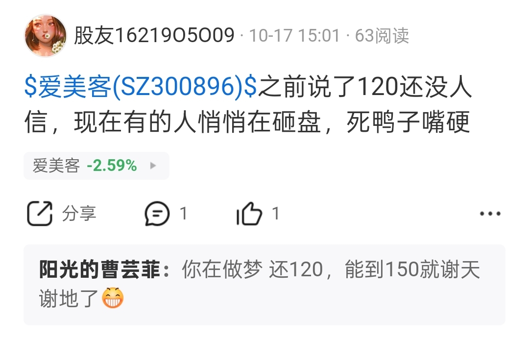 温馨提示: 1.根据《证券法》规定,禁止编造、传播虚假信息或者误导性信息,扰乱证券市场;2.用户在本社区发表的所有资料、言论等仅代表个人观点,与本网站立场无关,不对您构成任何投资建议。用户应基于自己的独立判断,自行决定证券投资并承担相应风险。《东方财富社区管理规定》
