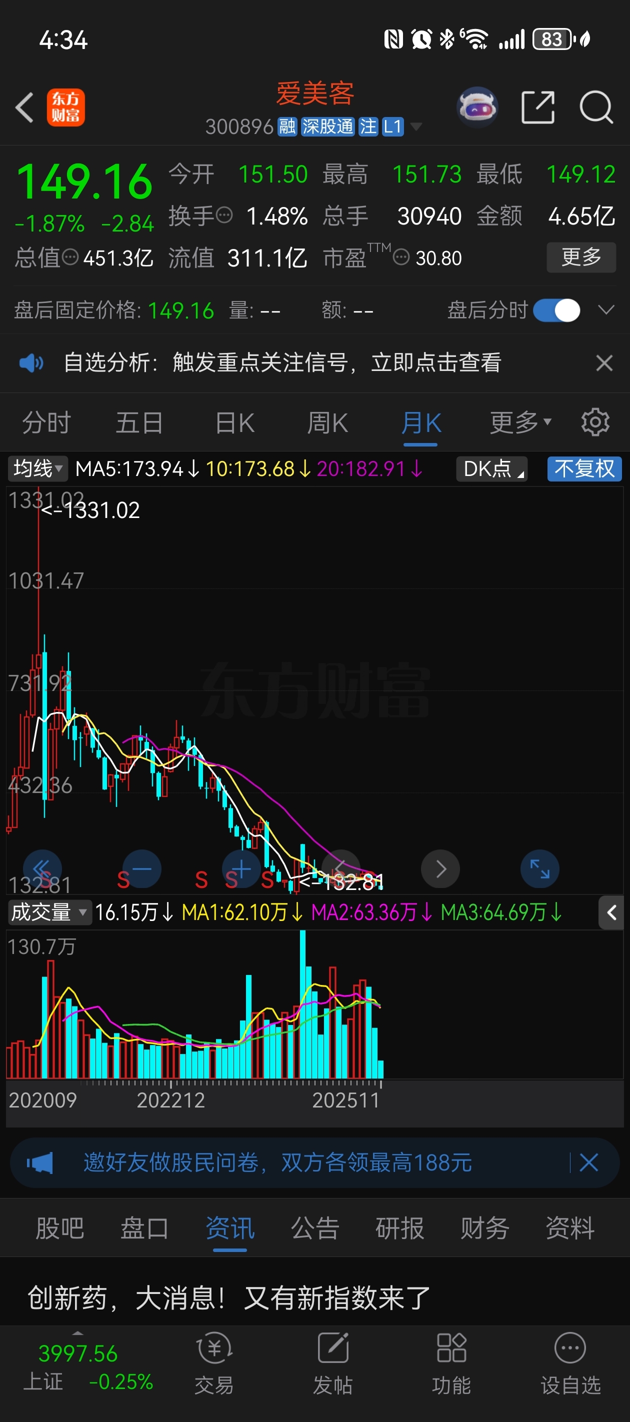 $爱美客(SZ300896)$ 股价跌了这么久,业绩才出现下滑,不得不佩服主力的预见性,散户怎么和他们玩???