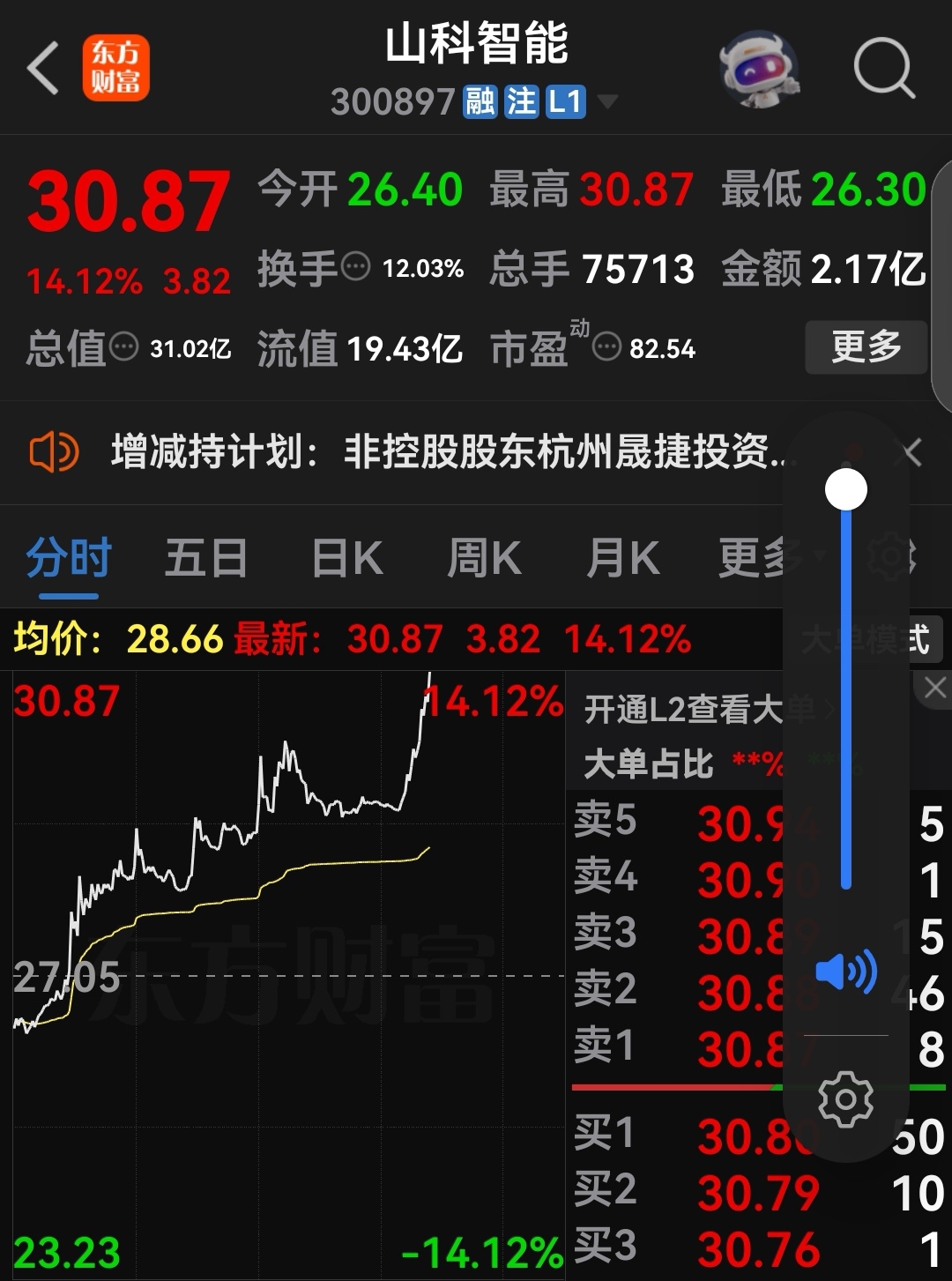 以30.58继续挂单减仓卖出山科智能,想不到居然一成交又就冲向31.49,真是没