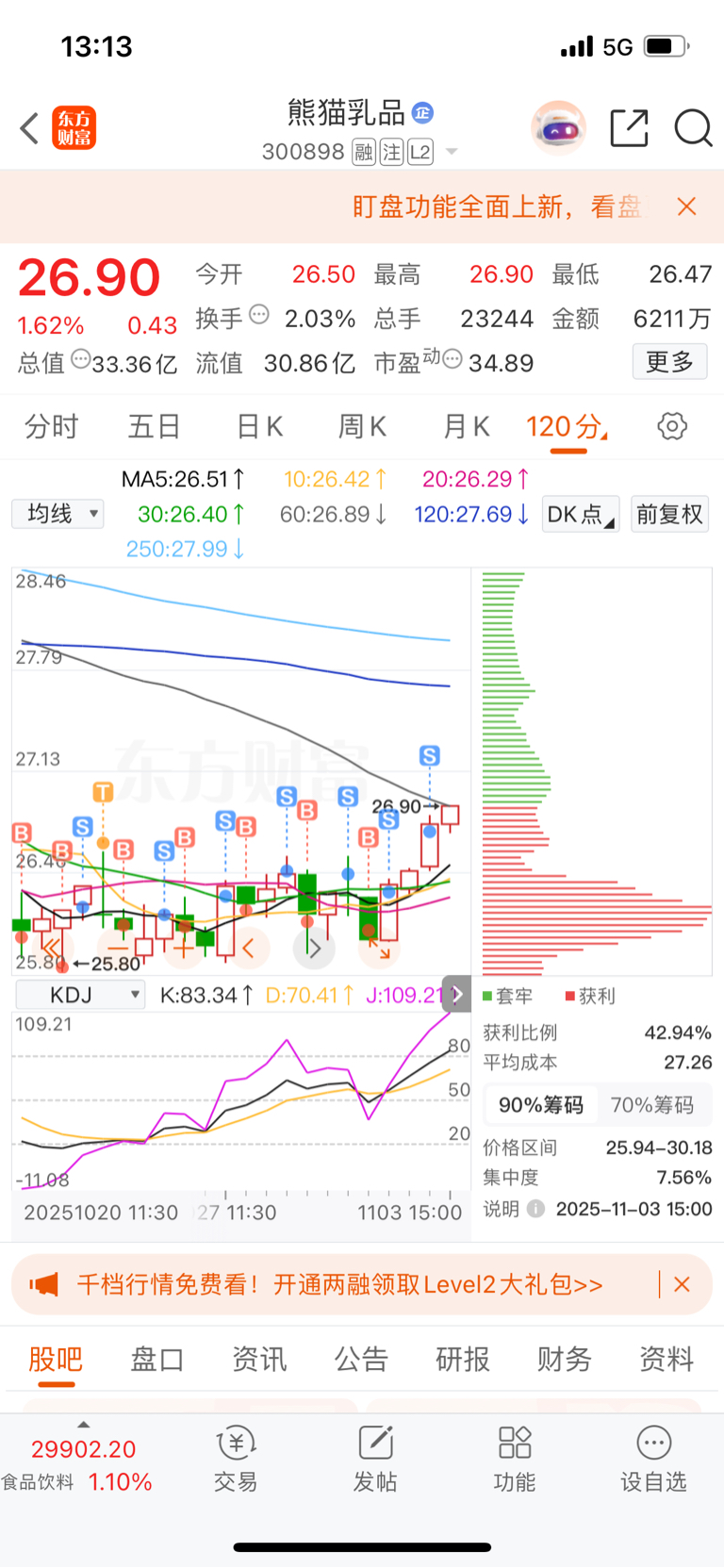 $熊猫乳品(SZ300898)$ 不知道J值过百的分时能走到哪一步,但还是以均价为界做好震荡准备