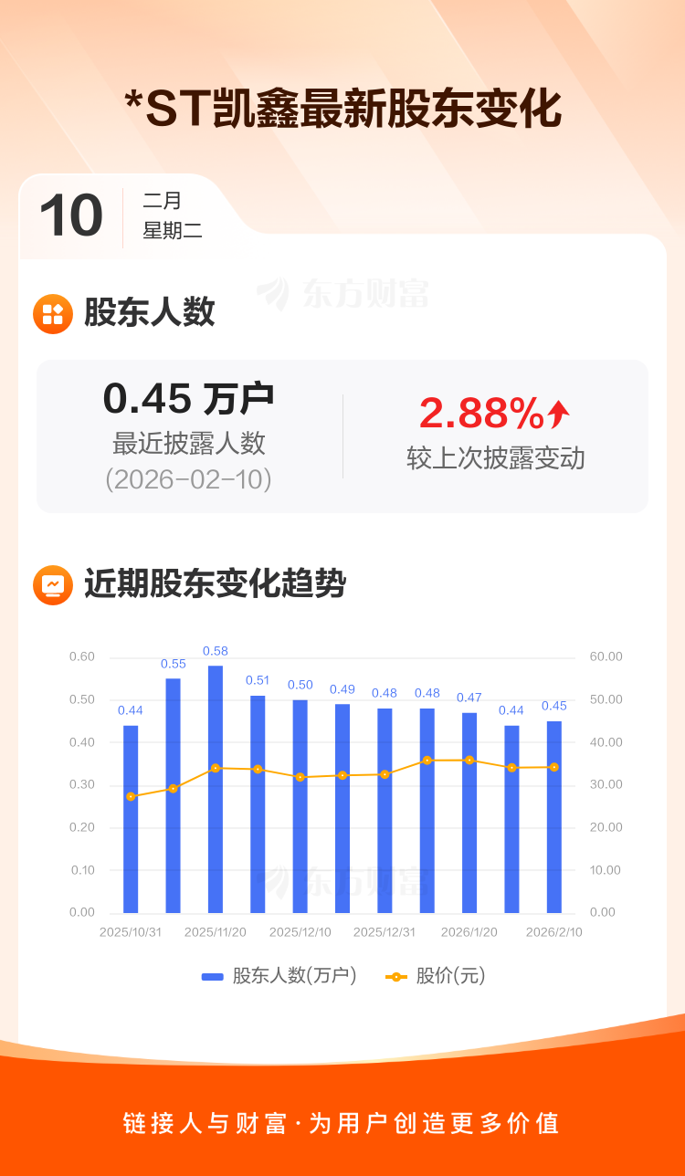 *ST凯鑫最新披露数据显示,截至2月10日公司股东户数为4542户,较上期(2026年1月30日)增加127户,增幅为2.88%。户均持有流通股数量由上期的9272股下降至9012股,户均持股金额由上期的31.62万元减少至30.87万元。
