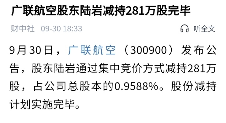 《此股有打压。》广联航空股东陆岩减持281万股完毕财中社09-3018:339月