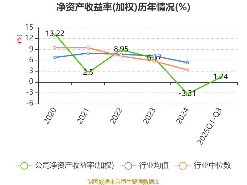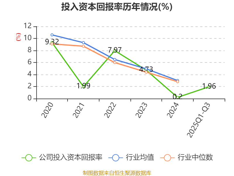 盈利能力方面, 2025年前三季度公司加权平均净资产收益率为1.24%,同比下降2.11个百分点。公司2025年前三季度投入资本回报率为1.96%,较上年同期下降0.53个百分点。