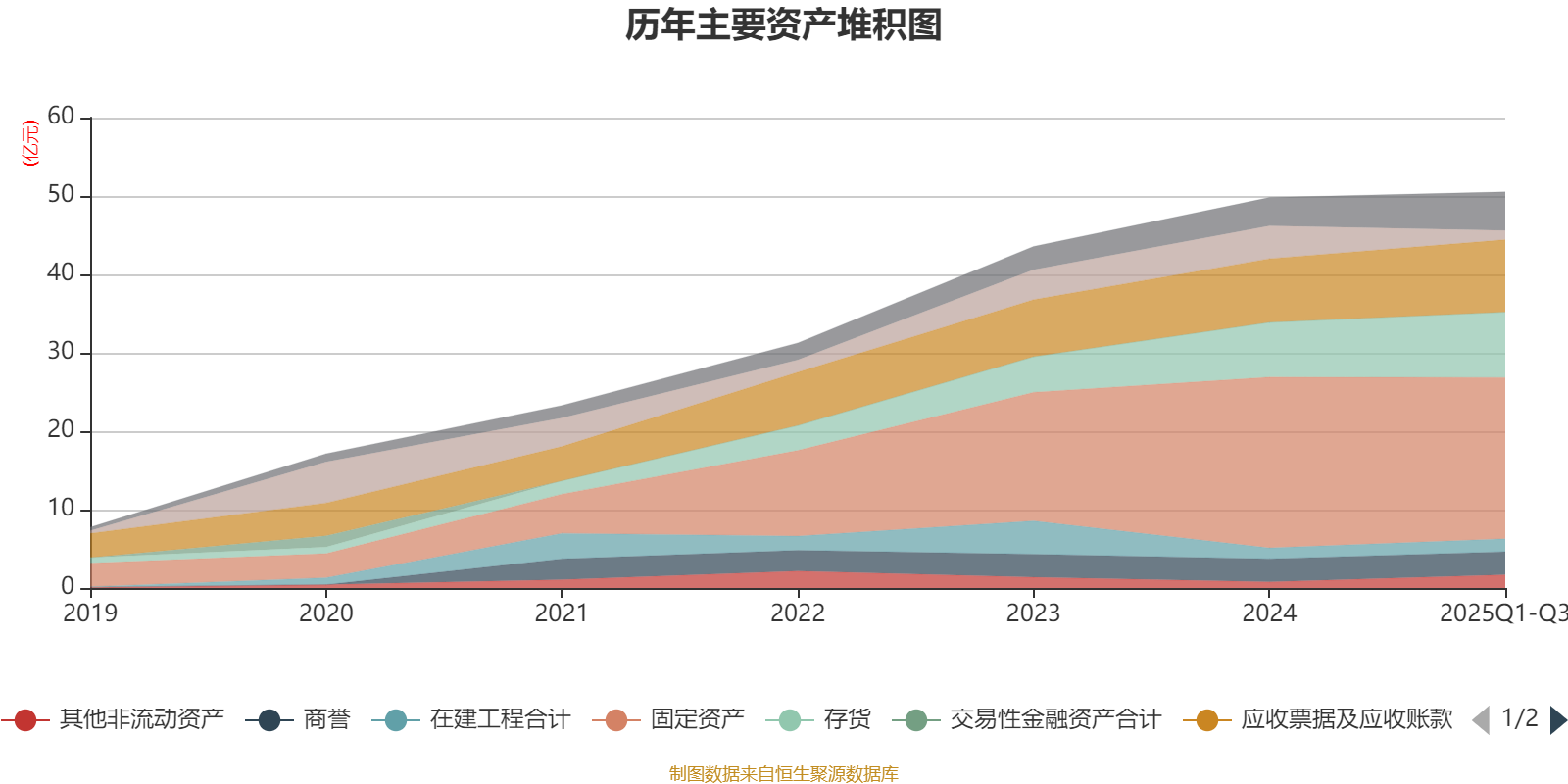 资产重大变化方面,截至2025年三季度末,公司货币资金较上年末减少71.99%,占公司总资产比重下降6.09个百分点;固定资产较上年末减少5.57%,占公司总资产比重下降3.01个百分点;存货较上年末增加19.53%,占公司总资产比重上升2.5个百分点;应收票据及应收账款较上年末增加13.53%,占公司总资产比重上升1.95个百分点。