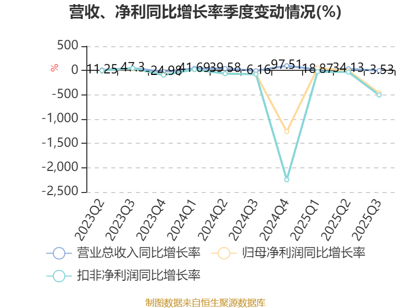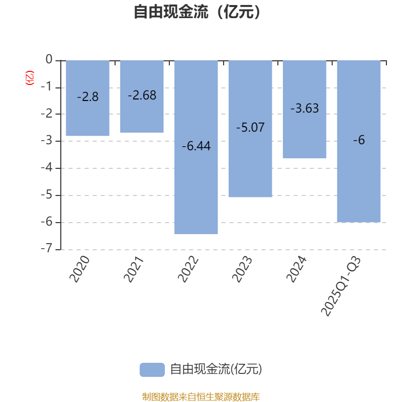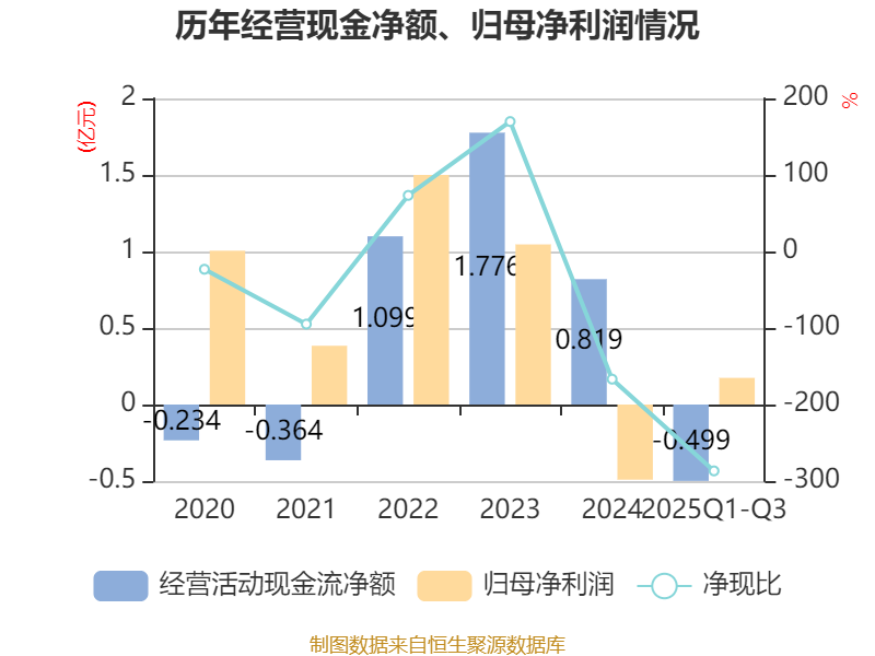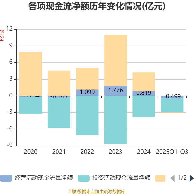 2025年前三季度,公司经营活动现金流净额为-4985.43万元,同比增加1.34亿元;筹资活动现金流净额-668.12万元,同比减少3.6亿元;投资活动现金流净额-2.45亿元,上年同期为-3.1亿元。