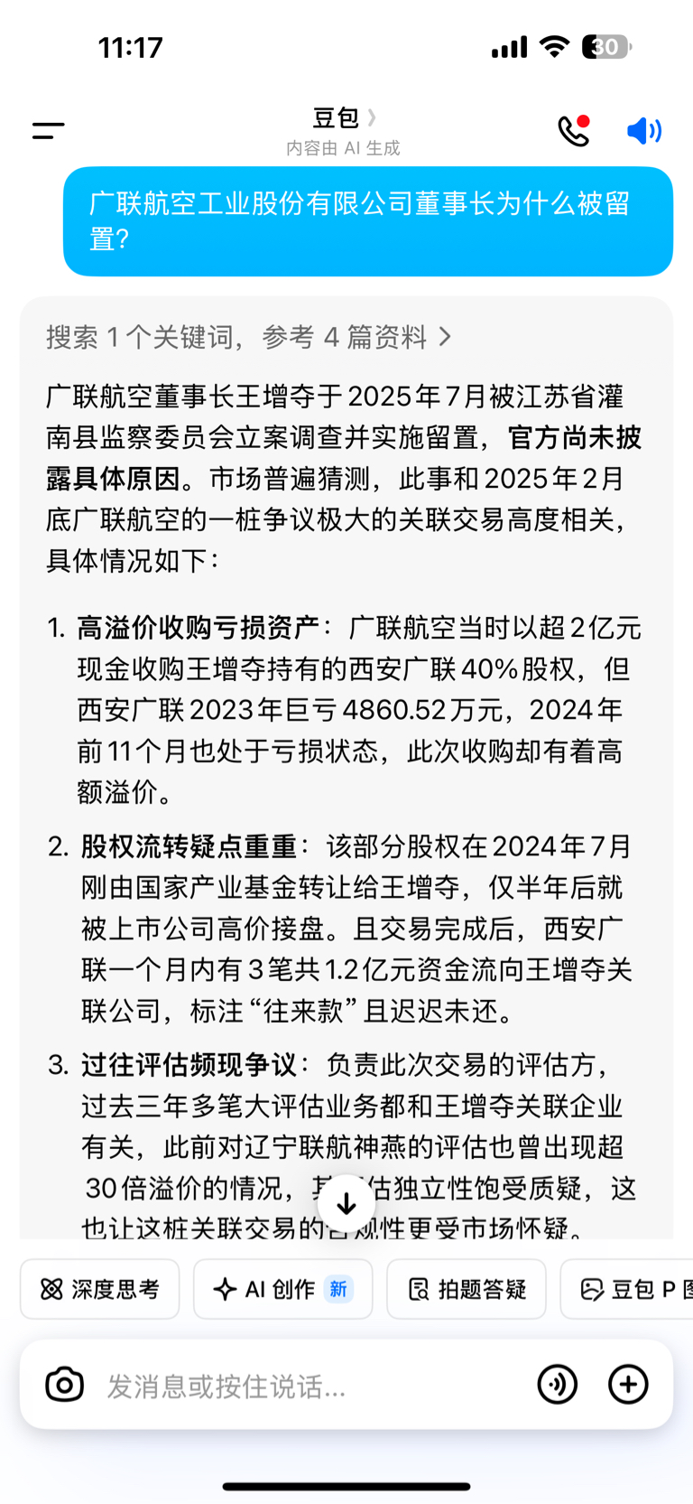 $广联航空(SZ300900)$ 昨天刚进、一看董事长为什么被留置?查了下豆包