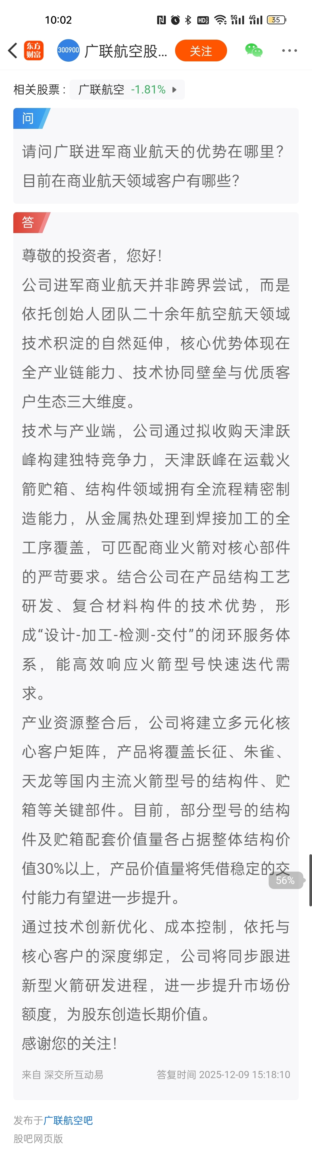$广联航空(SZ300900)$ 国内知名几家卫星发射供应商,主要部件.好古,莫慌。等待机会。