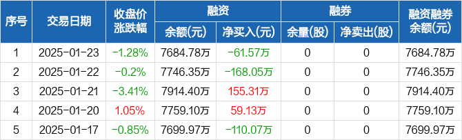中胤时尚:融资净偿还61.57万元,融资余额7684.78万元(01-23)