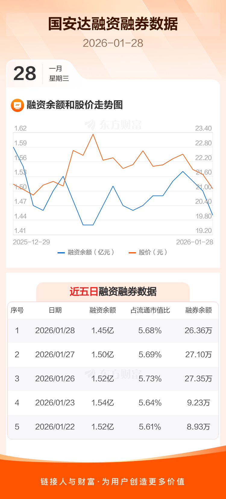 交易所最新数据显示,国安达于2026年1月28日获融资买入669.78万元,融资偿还1105.30万元,当日融资净偿还435.52万元。目前,该股融资余额1.45亿,占流通市值比例为5.68%。