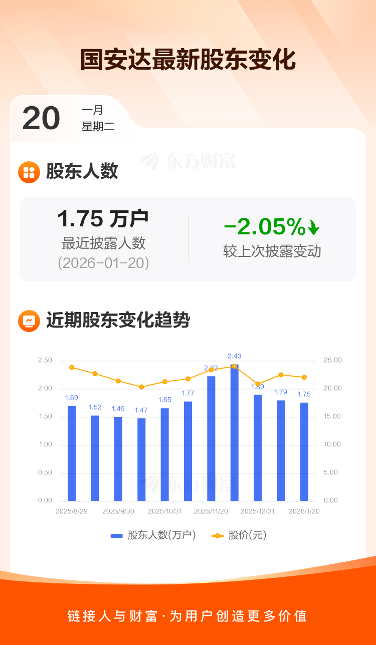 国安达:截至1月20日最新股东户数1.75万户,较上期减少2.05%