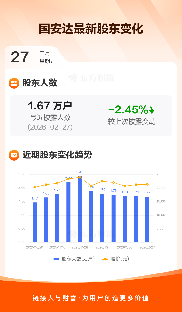 国安达:截至2月27日最新股东户数1.67万户,较上期减少2.45%