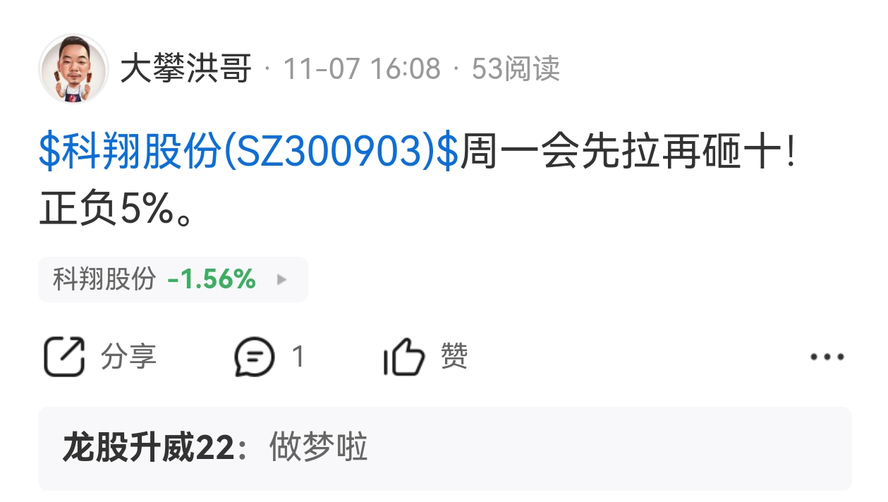 $科翔股份(SZ300903)$ 稍微有点误差。就看下午能不能回到红盘上方了。