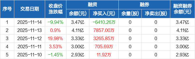 融资方面,当日融资买入1.06亿元,融资偿还1.7亿元,融资净偿还6410.26万元,净偿还额创12个月新高。融券方面,融券卖出0股,融券偿还0股,融券余量0股,融券余额0元。融资融券余额合计3.47亿元。