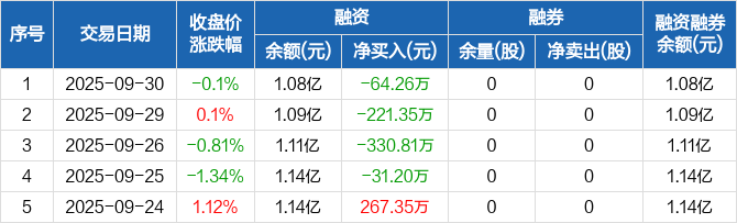 融资方面,当日融资买入465.4万元,融资偿还529.66万元,融资净偿还64.26万元,连续4日净偿还累计647.62万元。融券方面,融券卖出0股,融券偿还0股,融券余量0股,融券余额0元。融资融券余额合计1.08亿元。