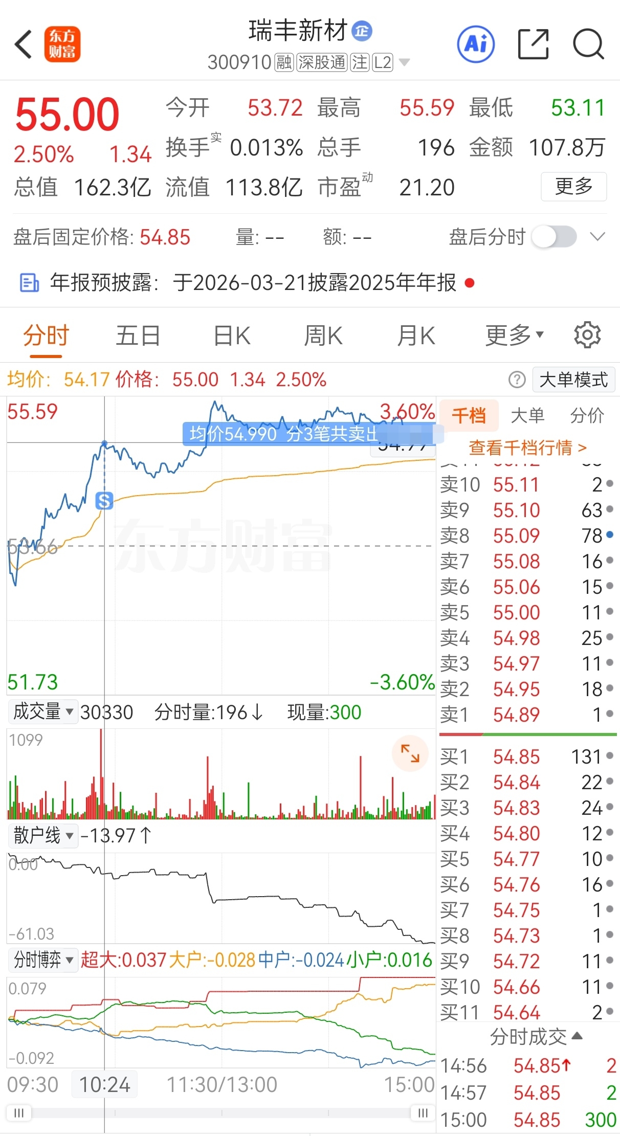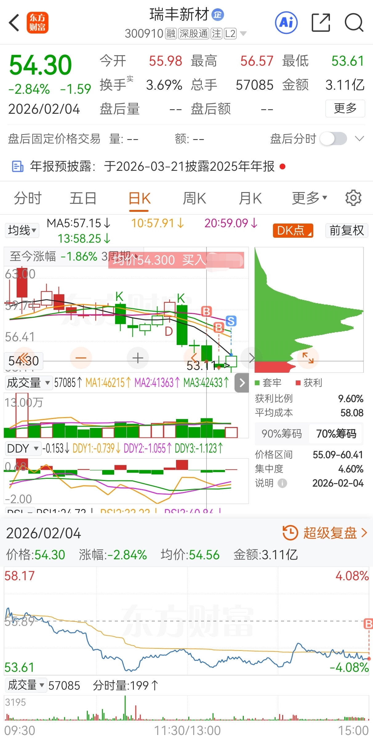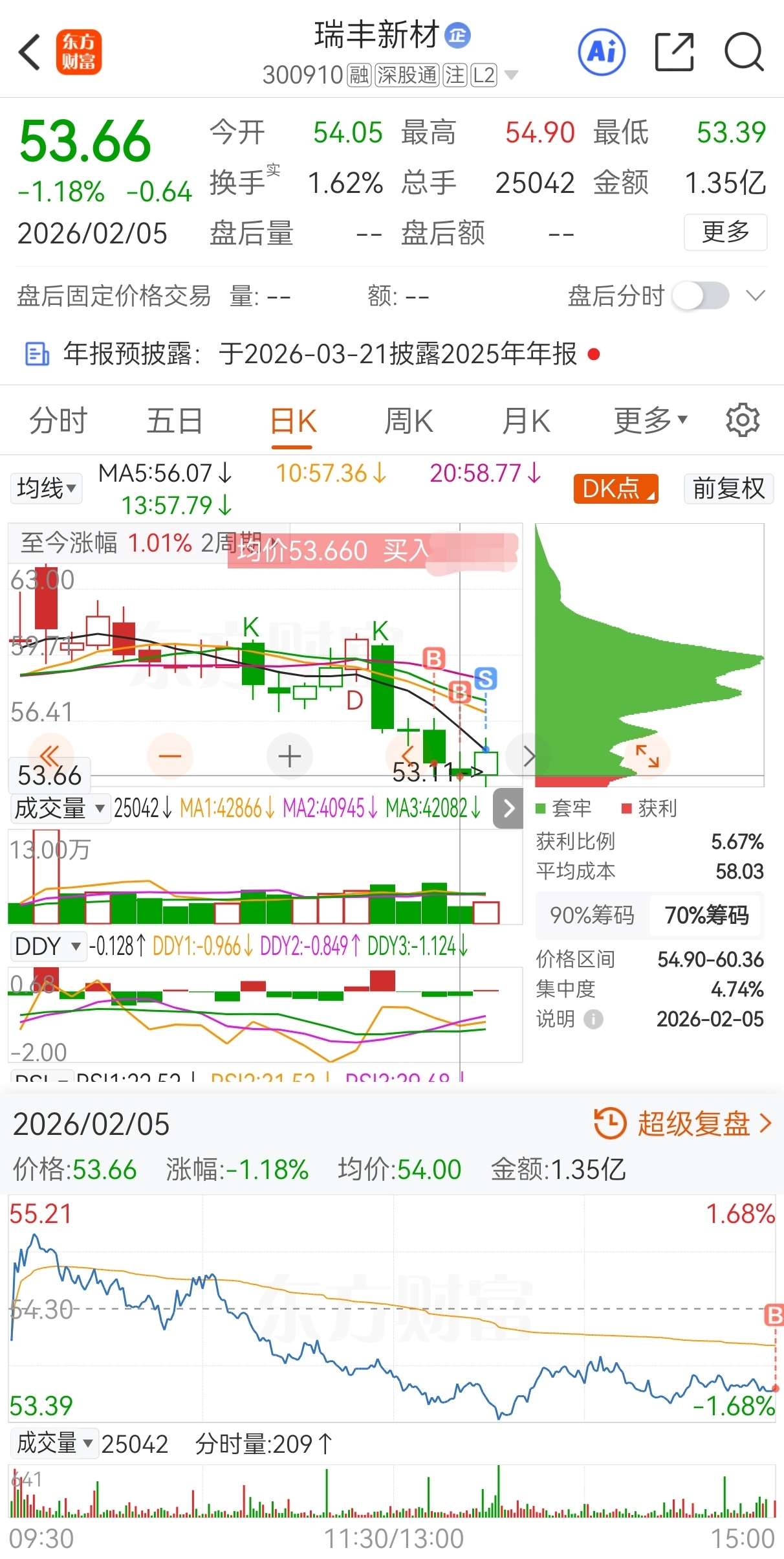 $瑞丰新材(SZ300910)$ 原计划今买明卖,实际54.3买,53.66加仓,54.99卖,实盘短线套利瑞丰新材,成功收米走人!