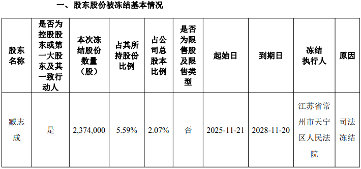 11月25日,凯龙高科(SZ 300912)发布公告称,公司近日通过中国证券登记结算有限责任公司系统查询,获悉公司控股股东臧志成先生所持公司部分股份被司法冻结。本次被冻结股份数量为237.4万股。截至本公告披露日,股东臧志成累计被冻结股份237.4万股。