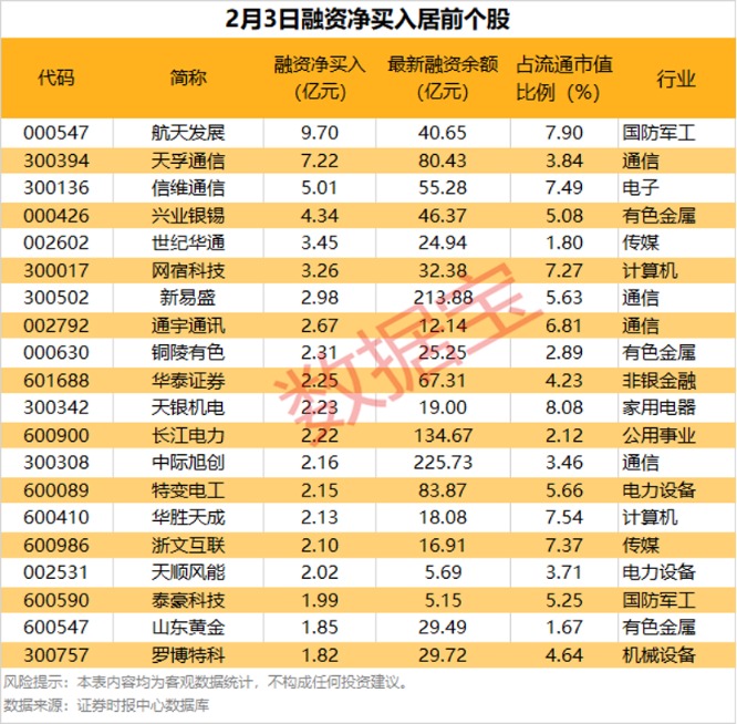 统计显示,具体到个股,2月3日共有1625股获融资净买入,净买入金额在千万元以上的有425股,其中39股融资净买入额均超1亿元。