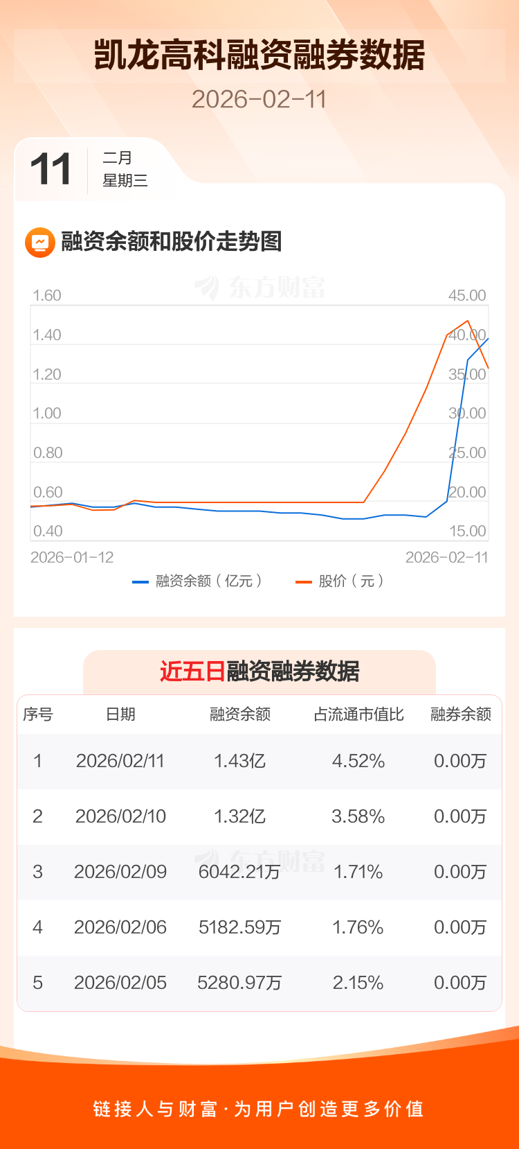 交易所最新数据显示,凯龙高科于2026年2月11日获融资买入9204.91万元,融资偿还8102.55万元,当日融资净买入1102.36万元。目前,该股融资余额1.43亿,占流通市值比例为4.52%。