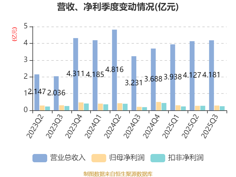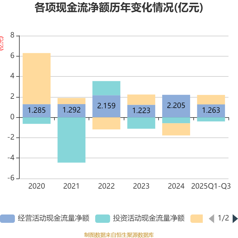 2025年前三季度,公司经营活动现金流净额为1.26亿元,同比下降11.45%;筹资活动现金流净额9296.85万元,同比增加2.68亿元;投资活动现金流净额-4038.1万元,上年同期为-1.31亿元。
