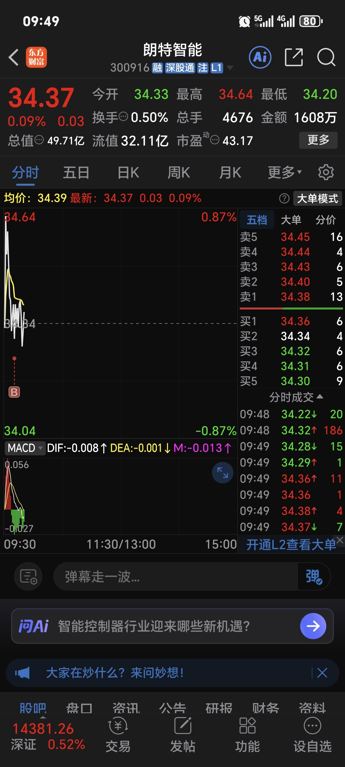 $朗特智能(SZ300916)$ 34.23再加了点,感觉有转稳的可能,博下周一拉就走,有朋友认为这个短线能成功吗?