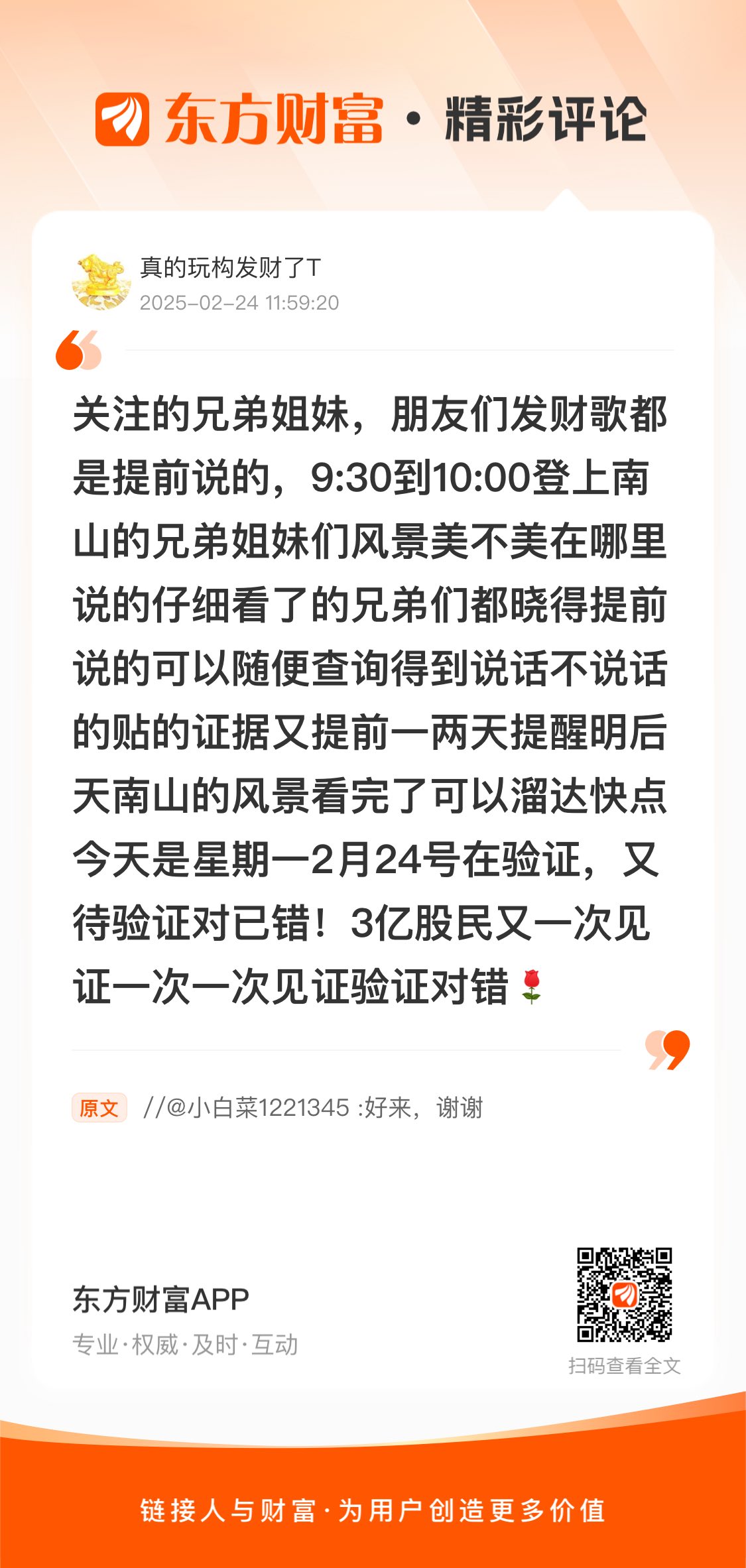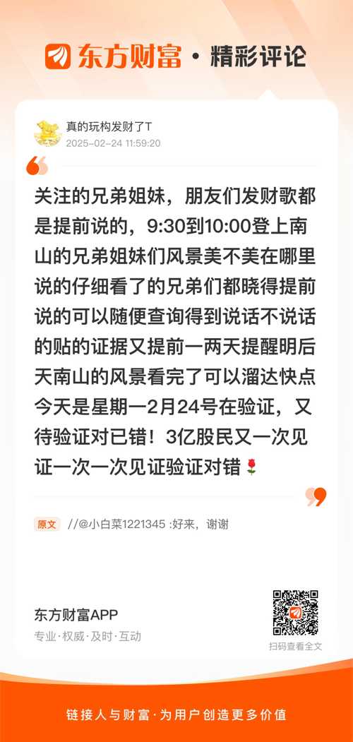 又对了吃大肉喝茅台关注的兄弟姐妹,朋友们发财歌都是提前说的,9:30到10:00登上南山的兄弟姐妹们风景美不美在哪里说的仔细看了的兄弟们都晓得提前说的可以随便查询得到说话不说话的贴的证据又提前一两天提醒明后天南山的风景看完了可以溜达快点今天是星期一2月24号在验证,又待验证对已错!3亿股民又一次见证一次一次见证验证对错