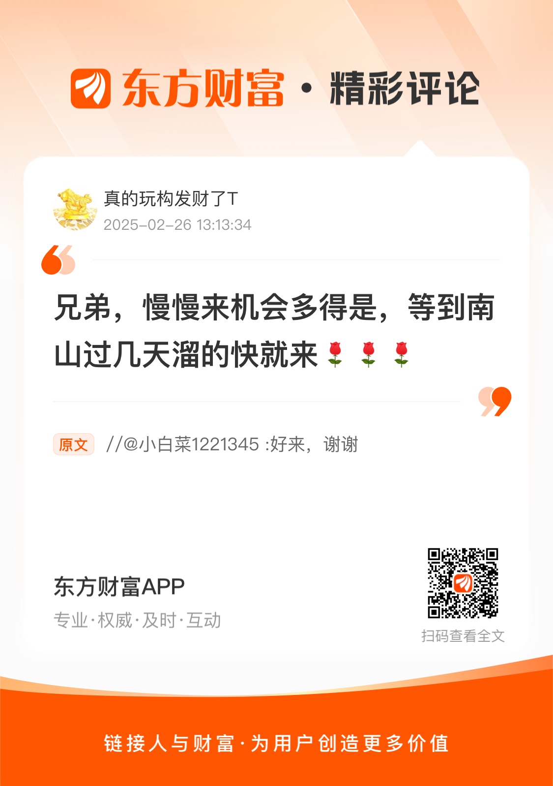 温馨提示: 1.根据《证券法》规定,禁止编造、传播虚假信息或者误导性信息,扰乱证券市场;2.用户在本社区发表的所有资料、言论等仅代表个人观点,与本网站立场无关,不对您构成任何投资建议。用户应基于自己的独立判断,自行决定证券投资并承担相应风险。《东方财富社区管理规定》
