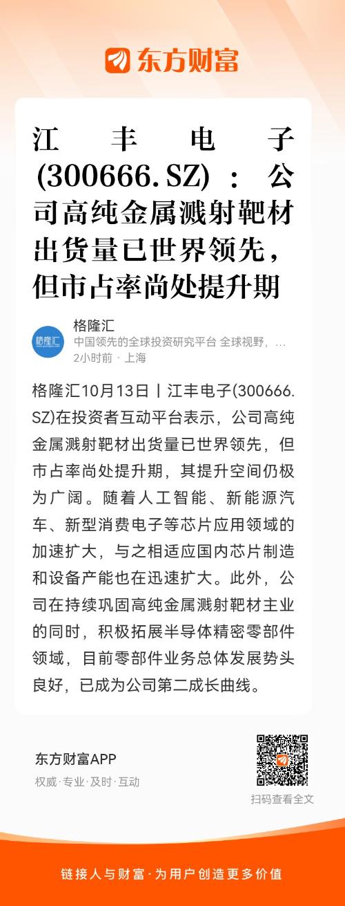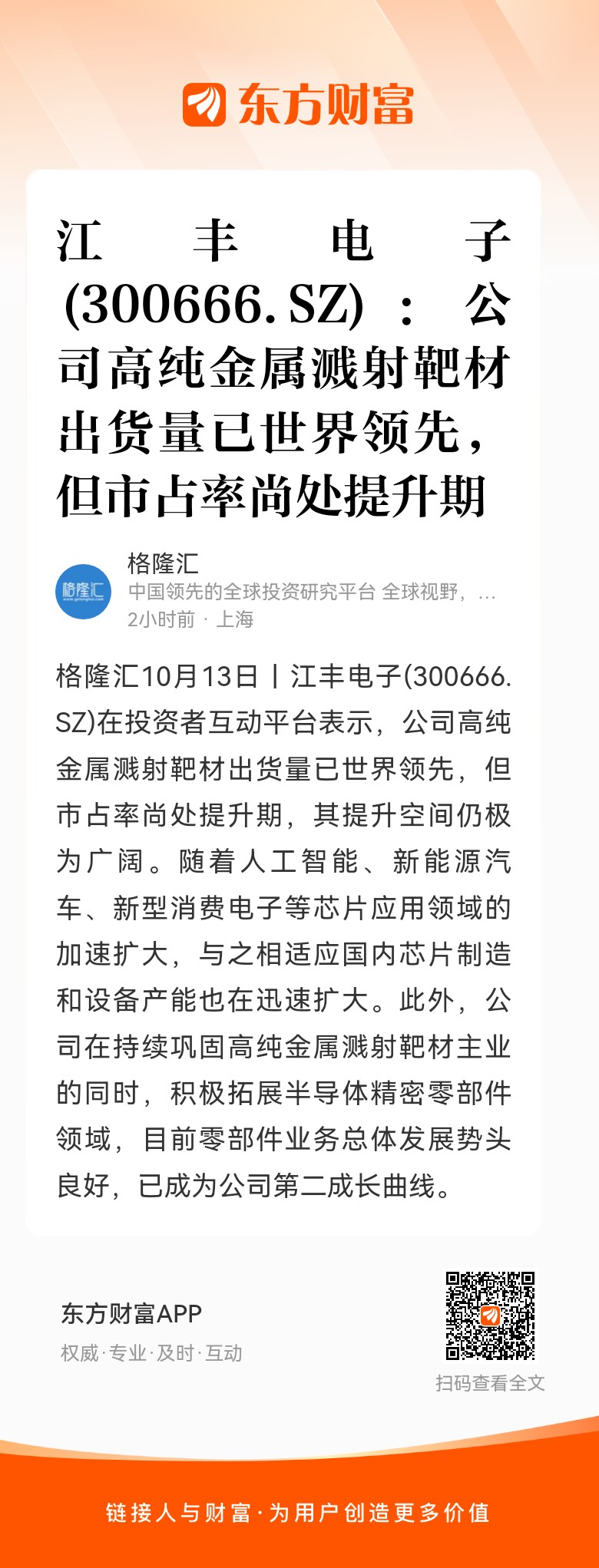 格隆汇10月13日丨江丰电子(300666.SZ)在投资者互动平台表示,公司高纯金属溅射靶材出货量已世界领先,但市占率尚处提升期,其提升空间仍极为广阔。随着人工智能、新能源汽车、新型消费电子等芯片应用领域的加速扩大,与之相适应国内芯片制造和设备产能也在迅速扩大。此外,公司在持续巩固高纯金属溅射靶材主业的同时,积极拓展半导体精密零部件领域,目前零部件业务总体发展势头良好,已成为公司第二成长曲线。