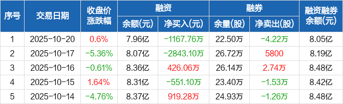 中伟股份:融资净偿还1167.76万元,融资余额7.96亿元(10-20)