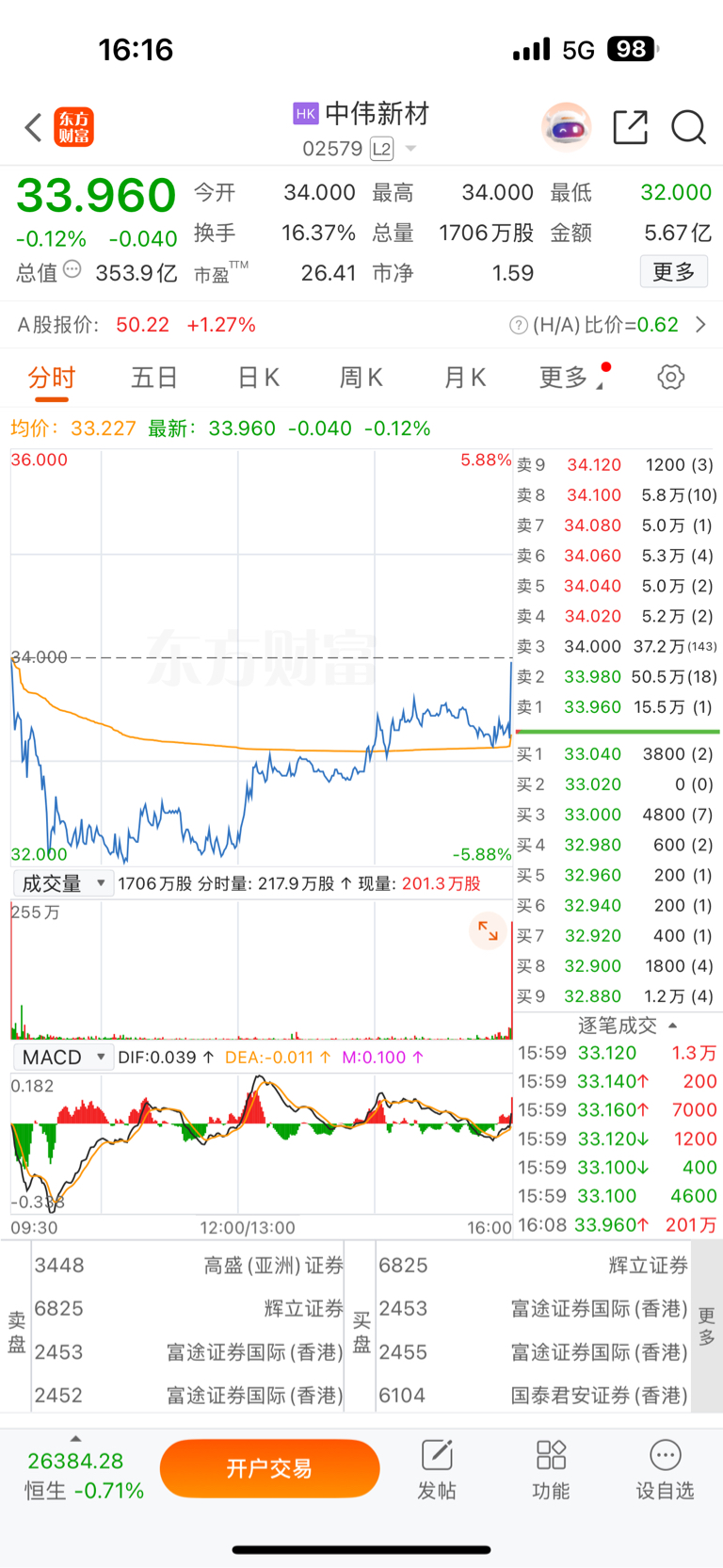 $中伟股份(SZ300919)$ 港股“中伟新材”尾盘201万手巨量拉升,收盘留下一条大长腿,这是啥意思?请各路高手帮忙分析一下。
