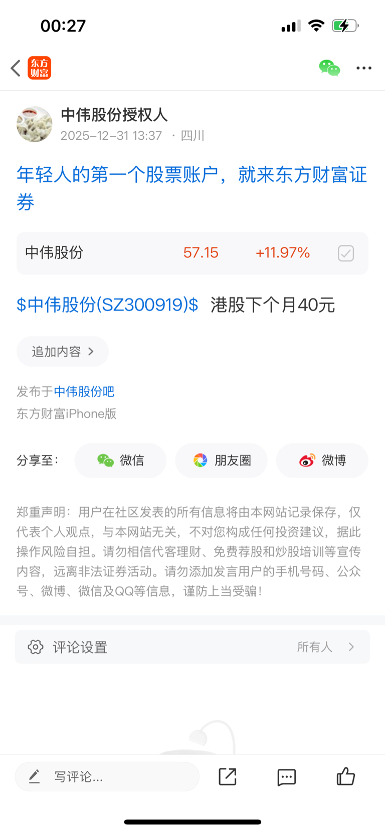 温馨提示: 1.根据《证券法》规定,禁止编造、传播虚假信息或者误导性信息,扰乱证券市场;2.用户在本社区发表的所有资料、言论等仅代表个人观点,与本网站立场无关,不对您构成任何投资建议。用户应基于自己的独立判断,自行决定证券投资并承担相应风险。《东方财富社区管理规定》
