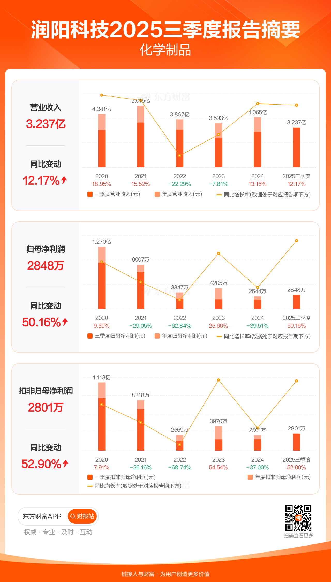 润阳科技10月29日发布2025年三季报显示,公司前三季实现营业收入3.24亿元,同比增长12.17%;归母净利润2847.65万元,同比增长50.16%;扣非归母净利润2801.44万元,同比增长52.90%。