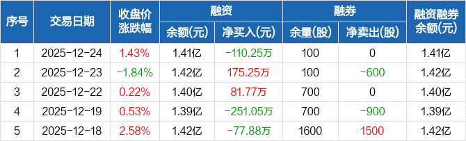 天秦装备:融资净偿还110.25万元,融资余额1.41亿元(12-24)