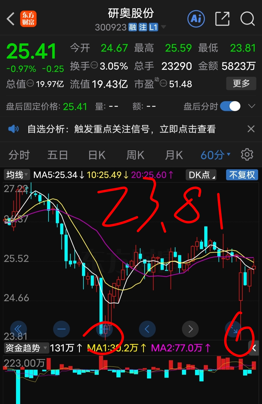 $研奥股份(SZ300923)$ 23.81双针不戳不戳探底成功