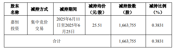 记者注意到,公司控股股东的一致行动人嘉恒投资刚于6月完成前次减持。6月11日至6月25日,嘉恒投资累计减持了166.38万股,减持比例为0.3831%,套现约4244万元。