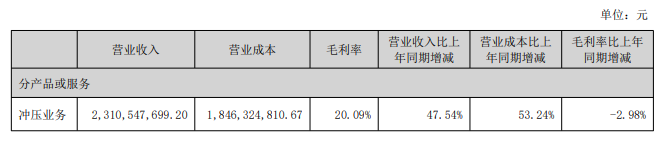 但营收净利高增长背后,公司冲压主业毛利率承压,同比减少2.98%至20.09%。博俊科技提示,公司的产品为汽车精密零部件和精密模具,均为非标定制产品。