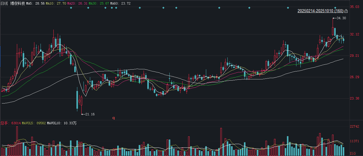 二级市场上,截至10月10日收盘,博俊科技下跌1.49%报31.16元/股,最新市值135.33亿元,今年来公司股价累计上涨超四成。