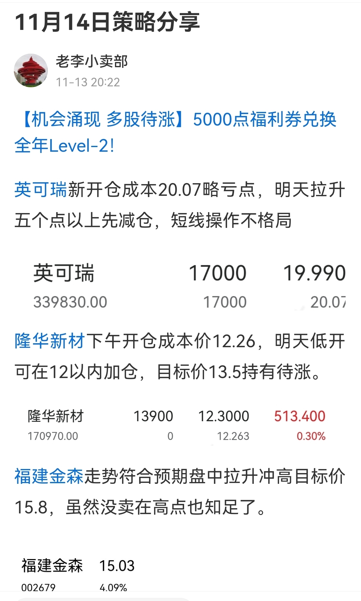 盘中拉升刚减仓机会,还有预期目标位还未到,详见14日策略分享及组合变化更新!