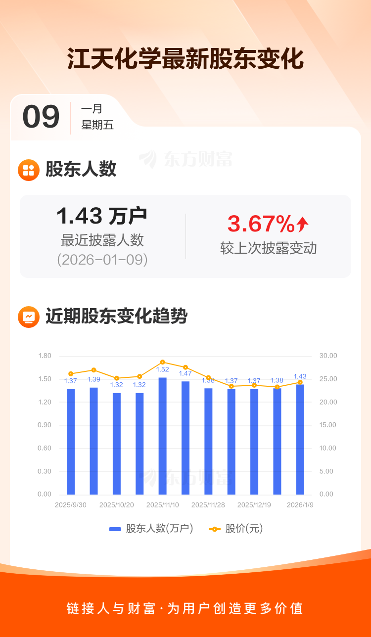 江天化学:截至1月9日最新股东户数1.43万户,较上期增加3.67%