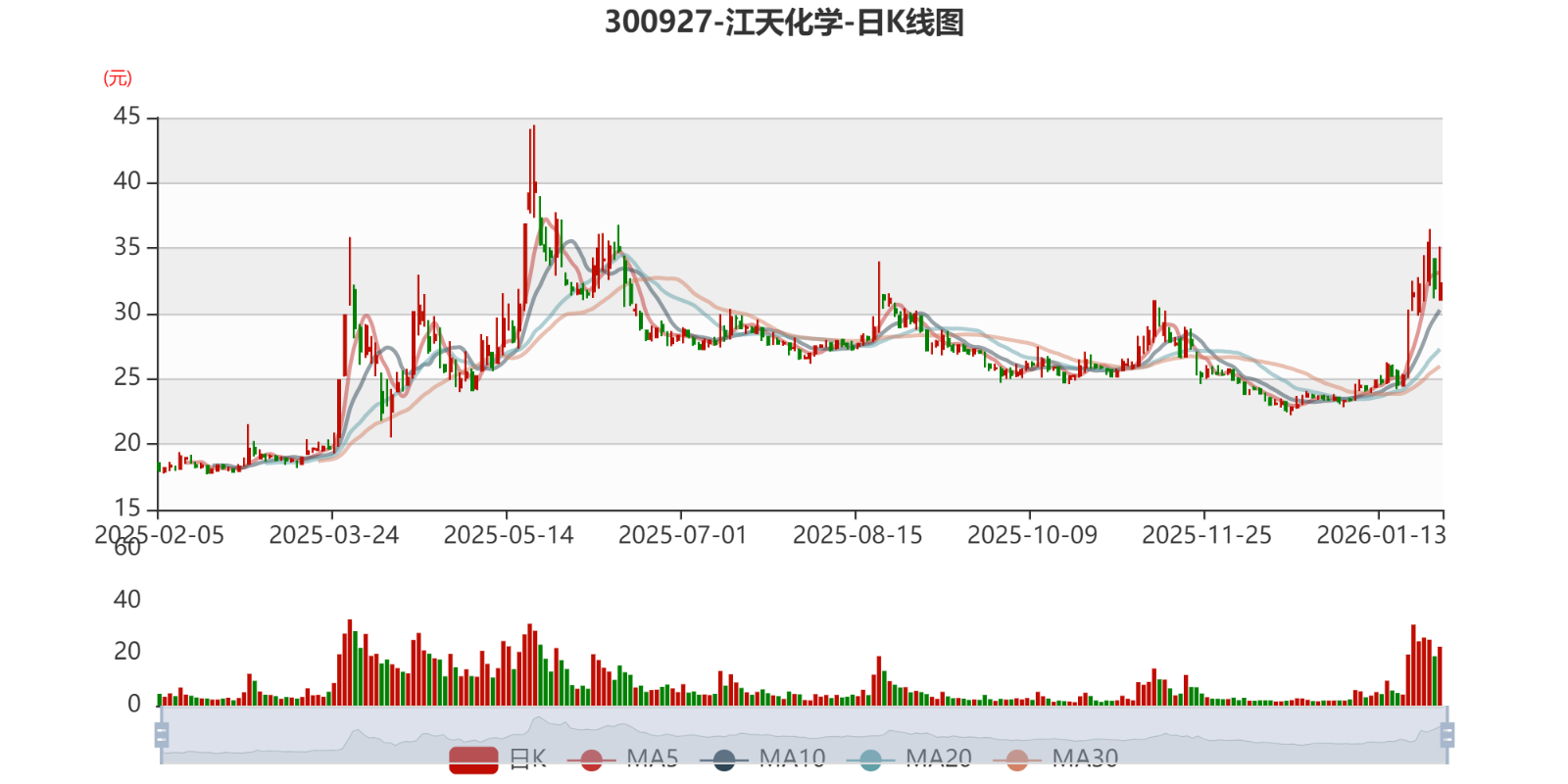 中证智能财讯江天化学(300927)1月28日晚间披露2025年度业绩预告,预计2025年归母净利润1590万元至2060万元,同比下降93.08%-94.66%;扣非净利润预计1244万元-1683万元,同比下降58.02%-68.97%。以1月28日收盘价计算,江天化学目前市盈率(TTM)约为226.49倍-293.44倍,市净率(LF)约4.85倍,市销率(TTM)约3.66倍。