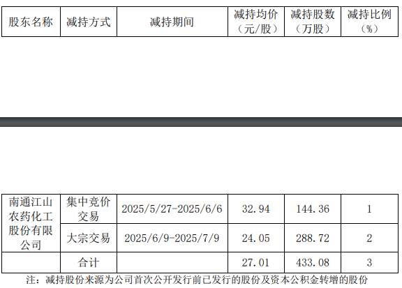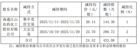 2月12日,江天化学(300927)发布公告称,持股9.02%的股东江山股份计划2026年3月17日至6月16日通过集中竞价或大宗交易减持不超过433.08万股,占公司总股本3.00%,其中集中竞价不超过144.36万股,大宗交易不超过288.72万股。持股来源为IPO前取得及资本公积金转增股本。