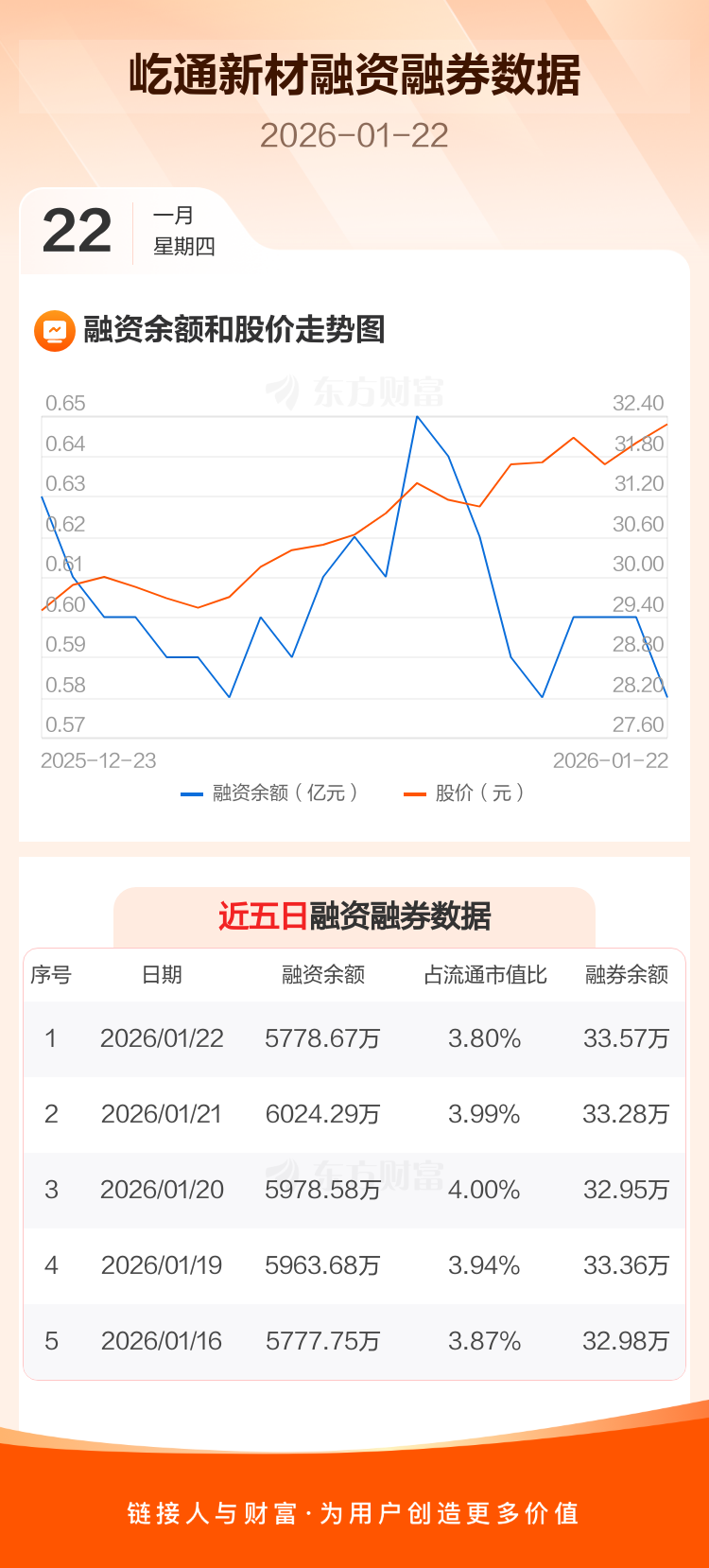交易所最新数据显示,屹通新材于2026年1月22日获融资买入336.07万元,融资偿还581.68万元,当日融资净偿还245.62万元。目前,该股融资余额5778.67万,占流通市值比例为3.80%。