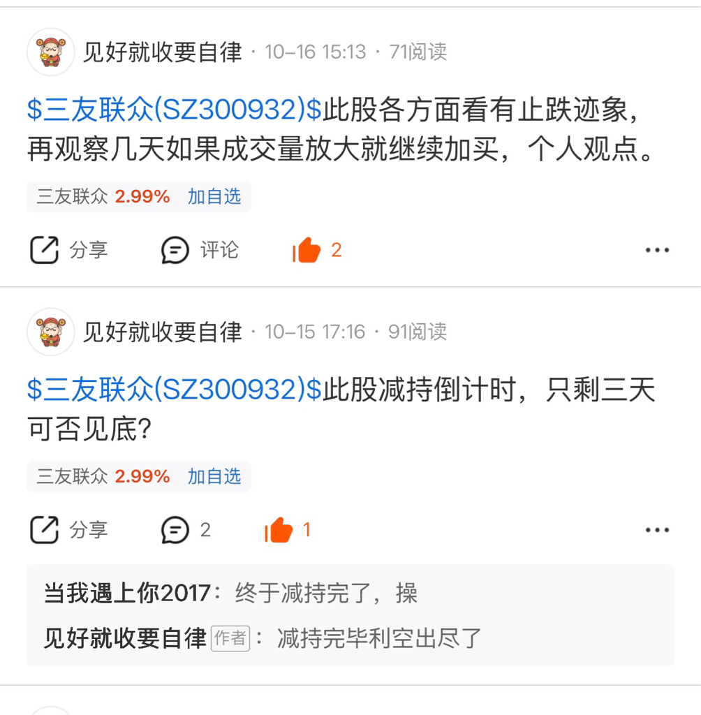 $三友联众(SZ300932)$ 本人10月15号,16号对此股判断,结合今天走势感觉还算蒙对了,这段时间适合做差,如果回调11.2左右可以买回,买进理由这一轮大盘涨该股一直跌,如果大盘继续回调此股机会大于风险,大家认可吗个人观点。