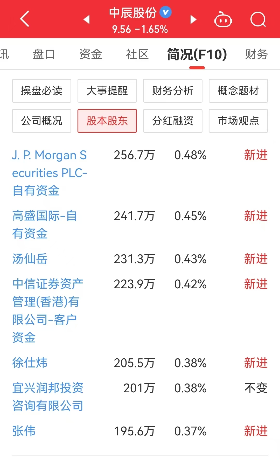 高盛、摩根大通等国际资本新进前十大股东。中辰股份三季报十大流通股东中,新进了J.