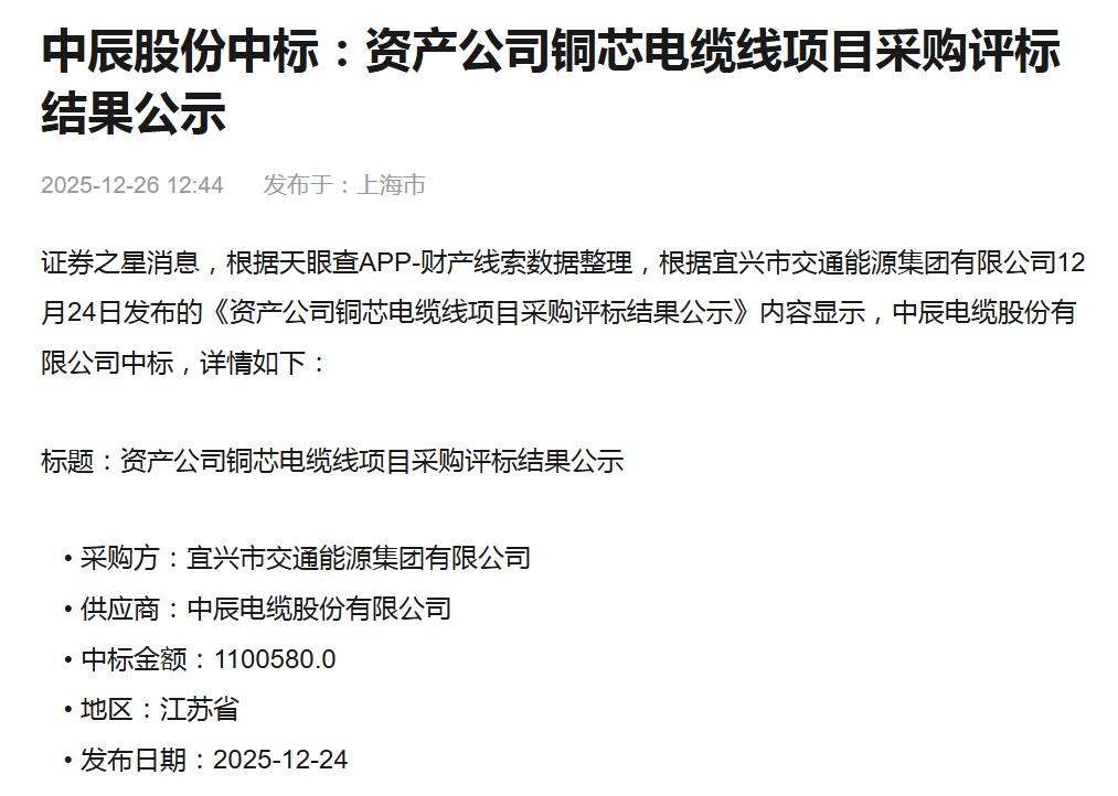 证券之星消息,根据天眼查APP数据整理,根据宜兴市交通能源集团有限公司12月24日发布的《资产公司铜芯电缆线项目采购评标结果公示》内容显示,中辰电缆股份有限公司中标。