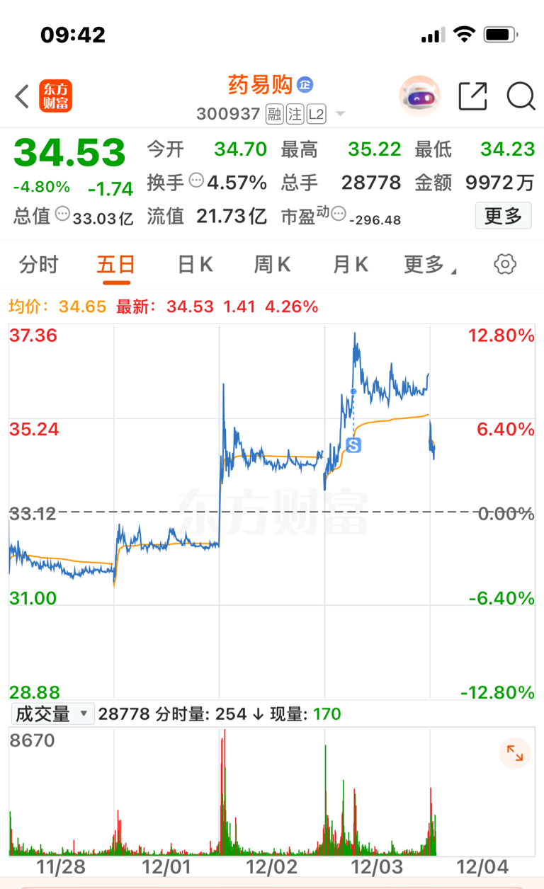 $药易购(SZ300937)$ #炒股日记# 再低一点让我在34以下买回。