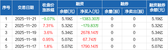 信测标准:融资净偿还1383.3万元,融资余额5.19亿元(11-21)