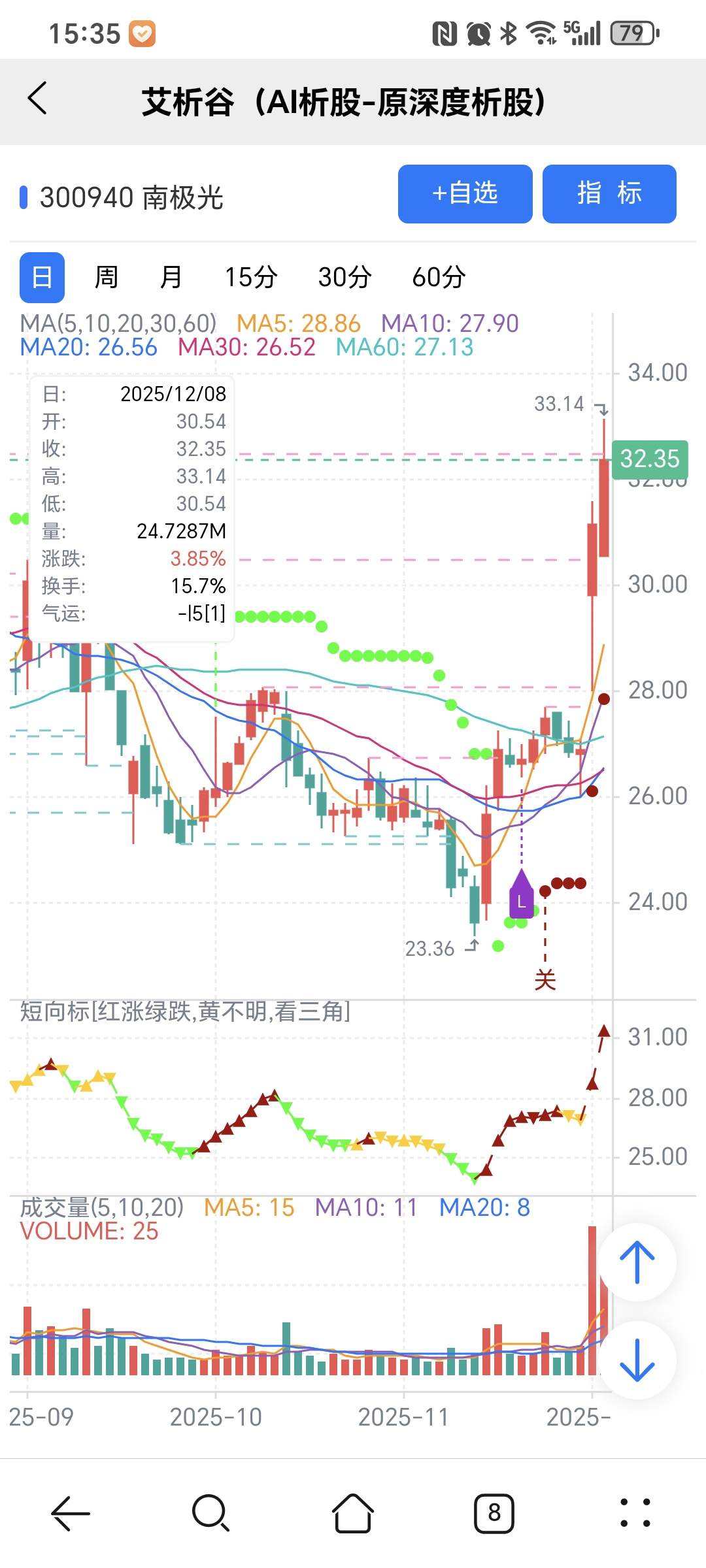 红绿小圆点是艾析谷的量化指标-超级短趋线,是趋势跟踪+突破类的量化指标,完全免费。